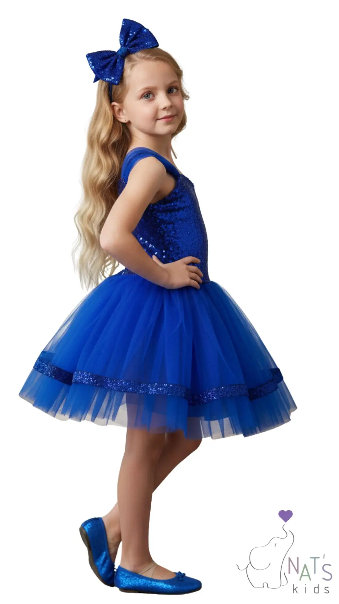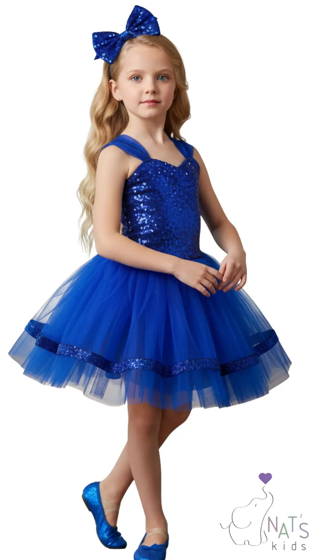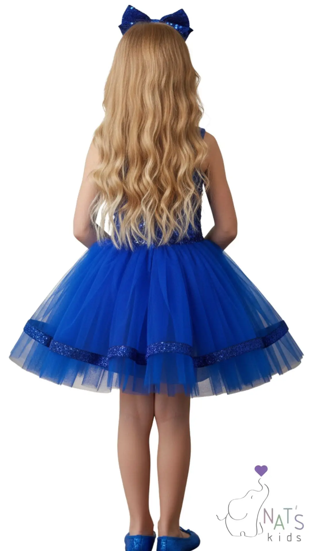 Üst Kısım (Beden): Elbisenin üst kısmı tamamen saks mavi rengi payetlerle kaplıdır. Bu payetler, ışık altında parlak ve göz alıcı bir etki yaratır. Askılı bir tasarıma sahiptir.