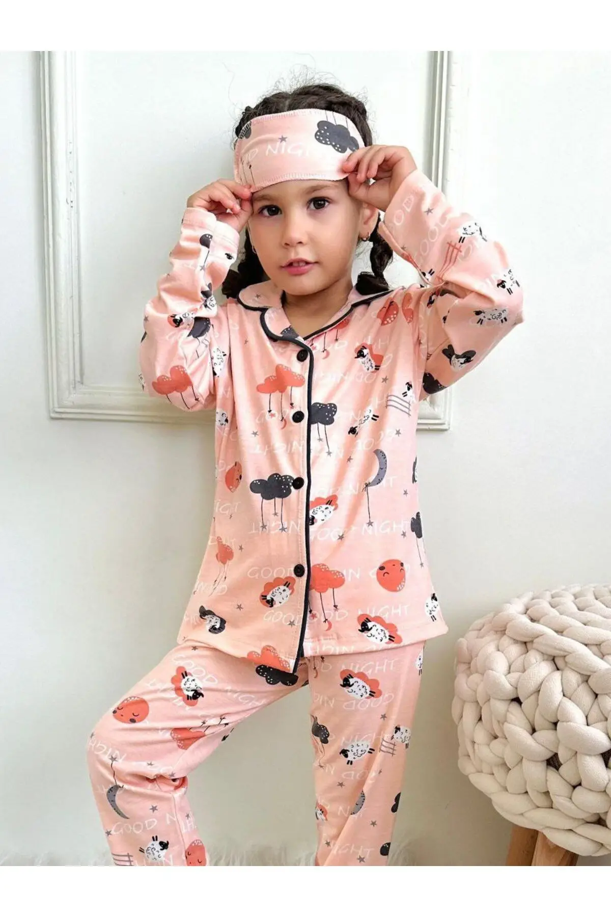 BULUT BASKILI GÖZ BANTLI ÖNDEN DÜĞMELİ 2İPLİK KIZ ÇOCUK PİJAMA TAKIMI