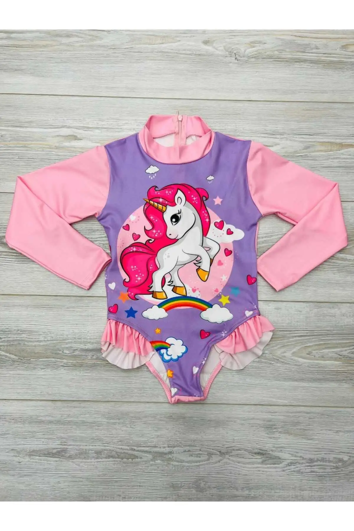 Uzun Kollu Karakter Baskılı Fırfır Detaylı Mayo